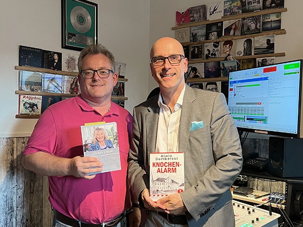 Alwin, zu Gast im Förde-Radio mit Moderator André, stellt sein neues Buch KNOCHEN-ALARM und die Biografie von Helga Entjer vor.